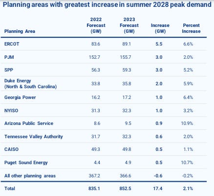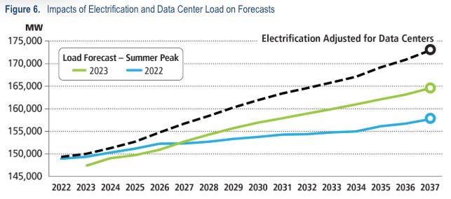 A recent Grid Strategies report (Grid Strategies 2023) analyzed the implications of data center electricity demand, and the numbers are staggering for an industry whose business model is predicated on slow and steady demand growth. These Summer 2028 forecasts (in gigawatts, that's 1 million kilowatts) of peak demand are striking in how they changed from 2022 to 2023: