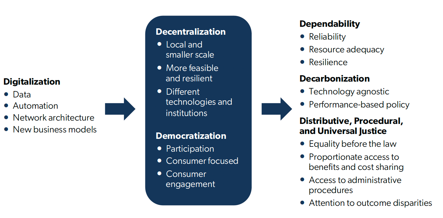 The report proposes a framework centered around six interrelated concepts: digitalization, decentralization, democratization, dependability, decarbonization, and justice. Realizing the full potential of these forces requires a rethinking of regulatory structures, business models, and investment strategies.