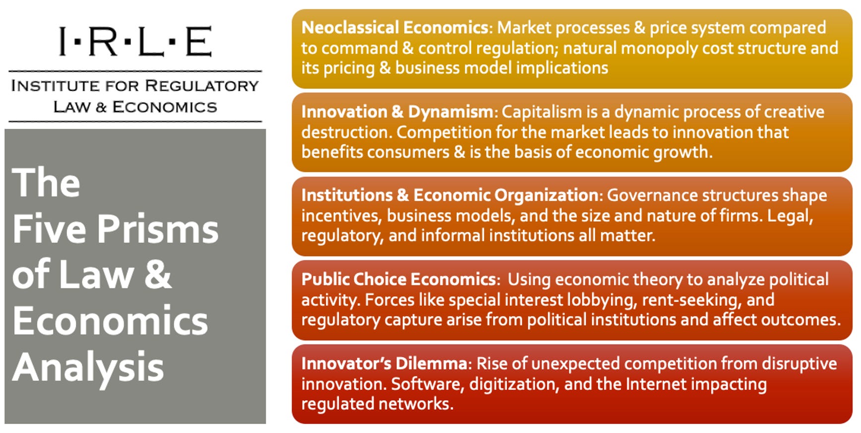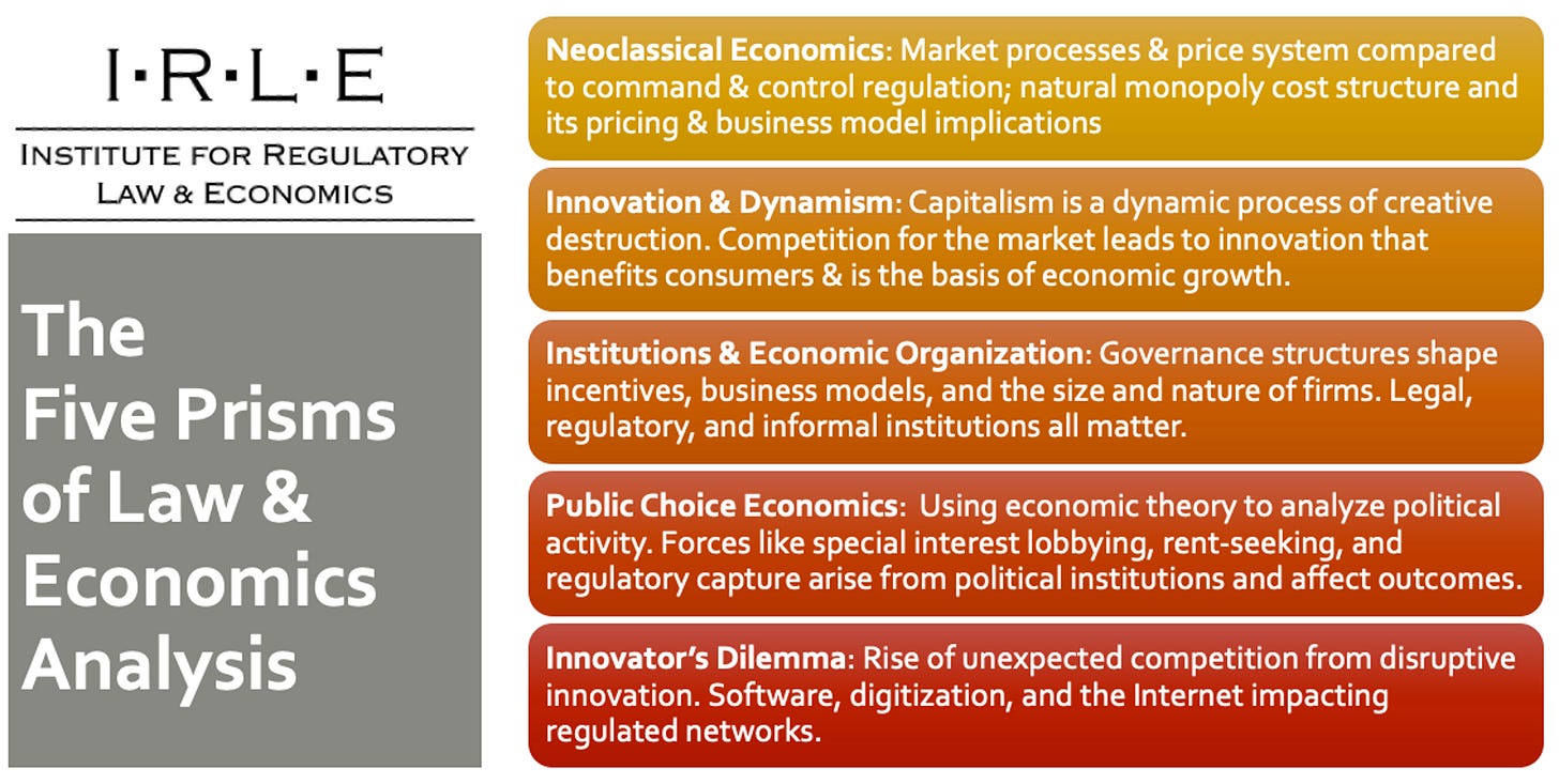 Public choice also shows up in the more applied, translational approach that I take to communicating with regulators and other policymakers, who are generally risk averse and reinforce the status quo bias of regulated utilities. Making sure that regulators and policymakers have sources of information about innovation other than regulated utilities reduces, but does not eliminate, the likelihood of regulatory capture. I use public choice thinking to create education and translational research for practitioners, putting theory into action. It's one of the Five Prisms of the Institute for Regulatory Law & Economics' workshop for public utility commissioners and staff, providing them with foundational economic principles to make better regulatory decisions in the face of dynamic technological change.