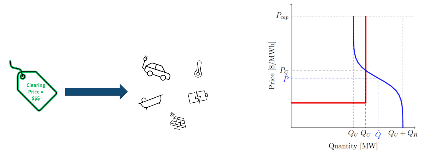 Suppose we all have thermostats connected to a digital communications network, and through that to a local energy market. Our thermostat settings are programmed with our preferences, which they can turn into a bid/willingness to pay into that market. Transactive energy harnesses digitization to automate your response to price signals based on your own preferences, bidding into an experimental-economics-style double auction. Now imagine that some of us in this local energy market have EVs, so we can charge when the price is low and discharge to sell out of our batteries when the price is high and the car is parked for a while.
