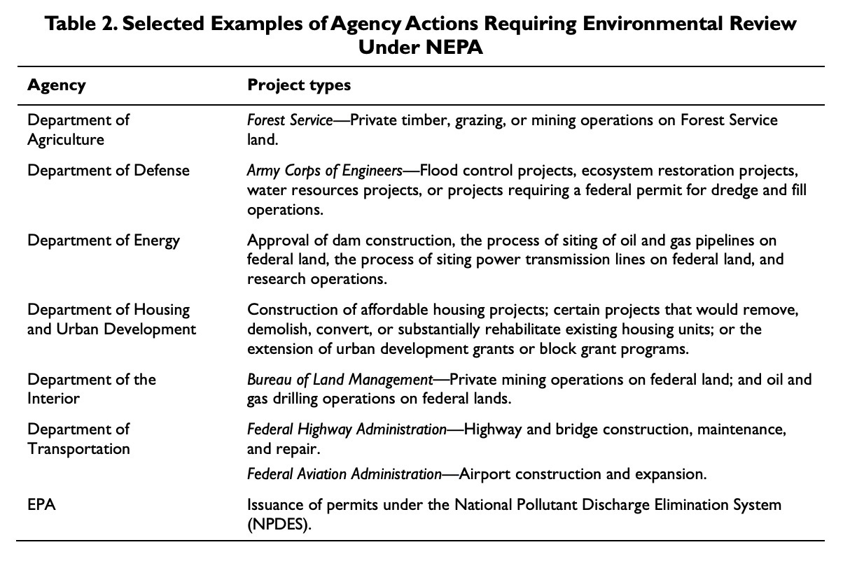 As is the case in most policy issues, there’s a nugget of truth in both of those claims. An environmental regulation layered on top of other federal environmental regulations, NEPA has had controversies over interpretation and scope, which have been litigated for all of the ensuing 53 years; the word “significant” does a lot of heavy lifting in determining whether a project triggers NEPA. Table 2 from the CRS report provides some examples, again from 2011, of projects/transactions involving federal agencies that require NEPA compliance.