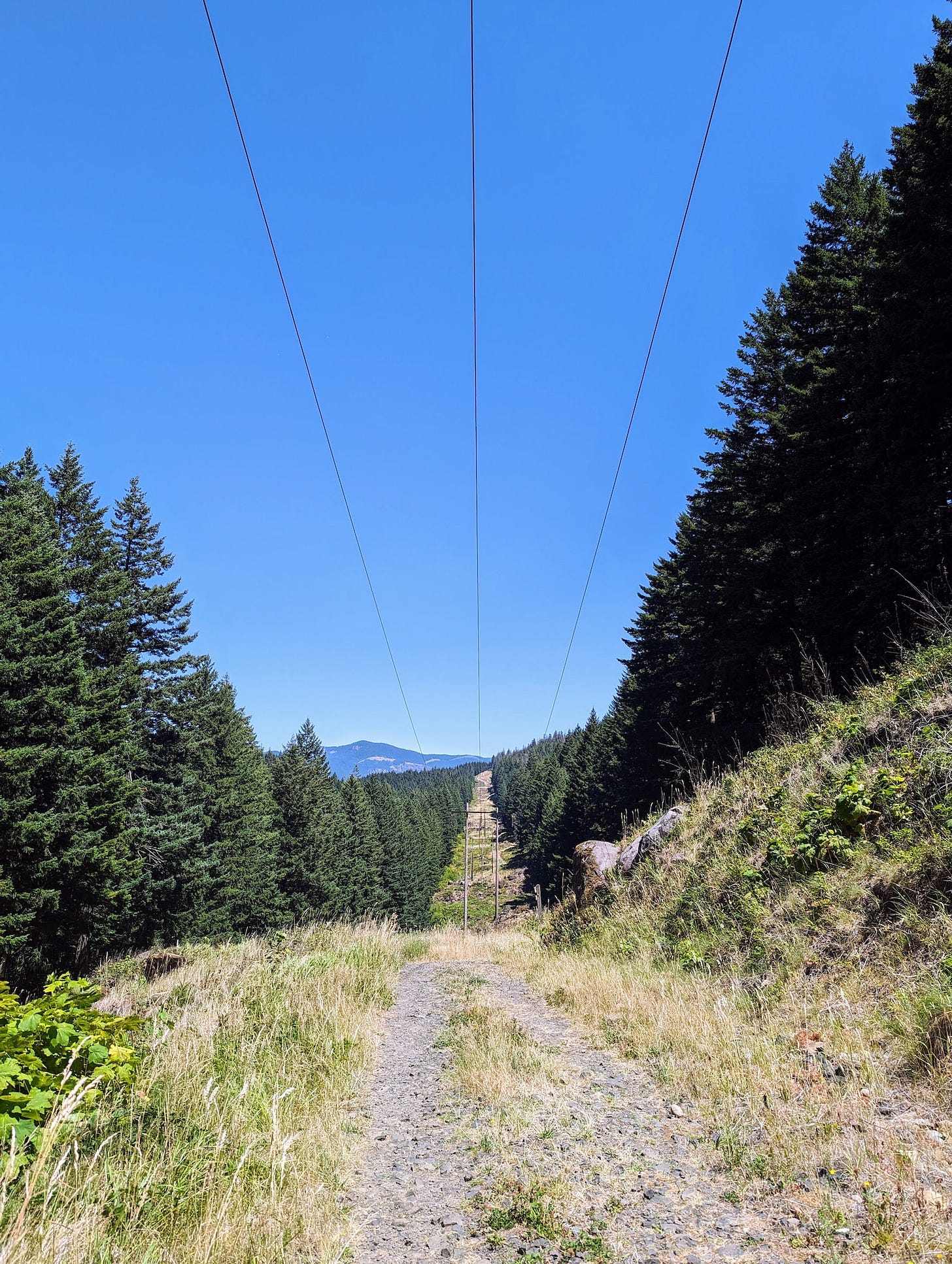 Transmission lines on the approach to the Herman Creek trailhead, Cascade Locks, Oregon, July 2023