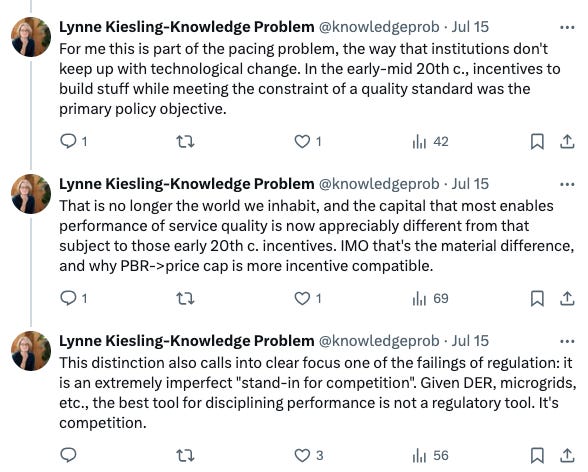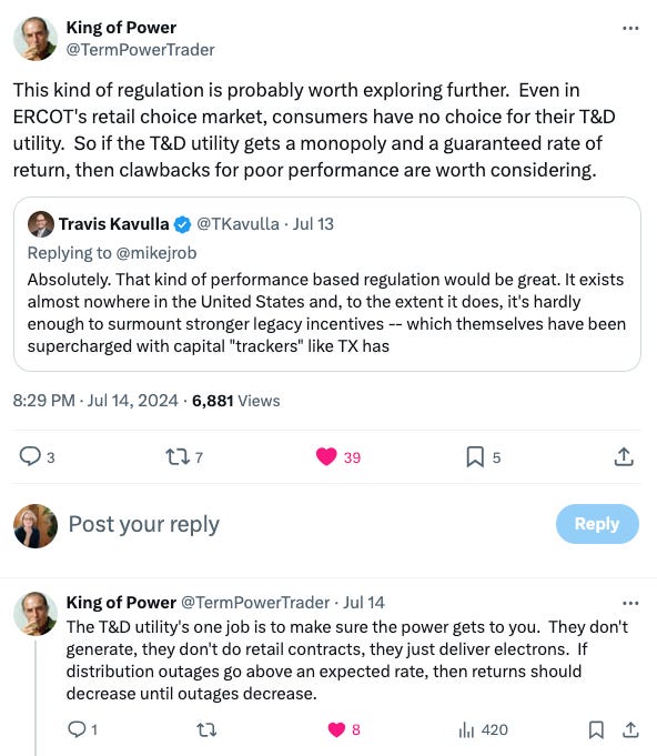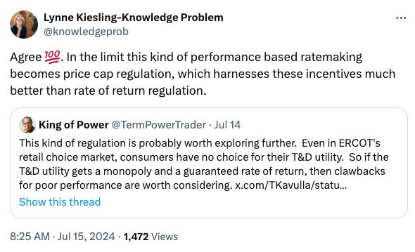 In addition to offering sympathy for the people in Houston affected by these events, I want to use the example of this compound disaster and a conversation on X/Twitter to broach this question: even in a state like Texas that has both retail and wholesale competition and regulates the wires companies, is traditional rate-of-return regulation a good institutional fit with ensuring resilience in the face of such events?