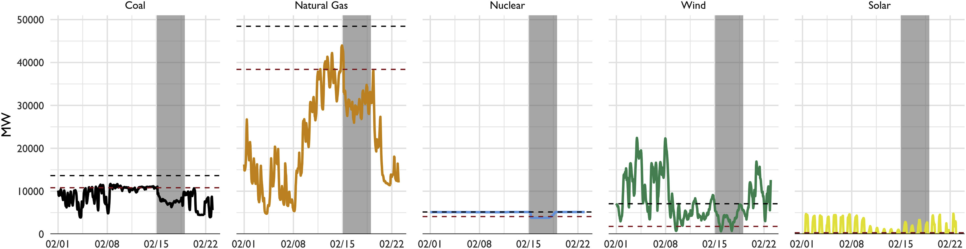 Source: Mays et al. (2022), Figure 1. Forecast capacity from the Winter 2020/21 Seasonal Assessment of Resource Adequacy shown in black dashed lines. Extreme case capacity from the Winter 2020/21 Seasonal Assessment of Resource Adequacy shown in red dashed lines. Period of load shed represented by gray shaded areas from February 15 1:00 a.m. through February 19 1:00 a.m.